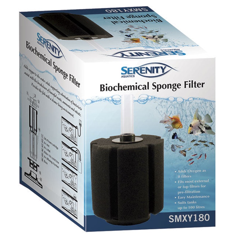 Serenity Spongefilters are a biological filtration that builds up a colony of good bacteria that breaks down the ammonia and nitrite as water passes through them and also collect detritus to help keep a clean aquarium.Uses air via a uplift system to draw water through the sponge.A low wattage air pump using air system and doubles oxygenating the water. Simply connect to a air pump (Sold separately).