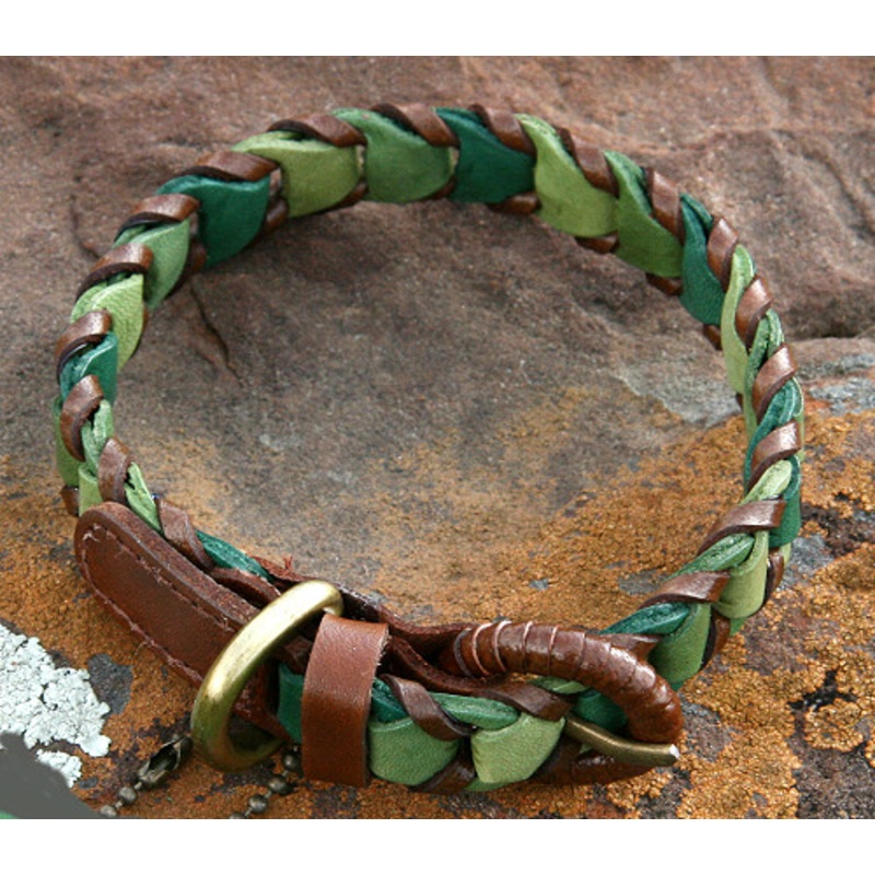 BAREBONE CLEARANCE - NOT RETURNABLESo Gorgeous, get ready for the compliments! This handmade leather collar with three shades of soft green leather is accented with brown leather. This collar will only get better in time! A must have for any pampered pet!
