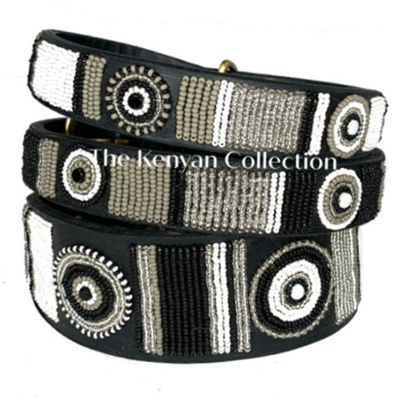 Shades Of Grey With CirclesAfrican Beaded Dog Collar & Leash CollectionBlack, grey, silver and white in stripes on black leather.Simply Gorgeous! Customers tell us these are the highest quality and most unique beaded collars they have ever seen. The beadin