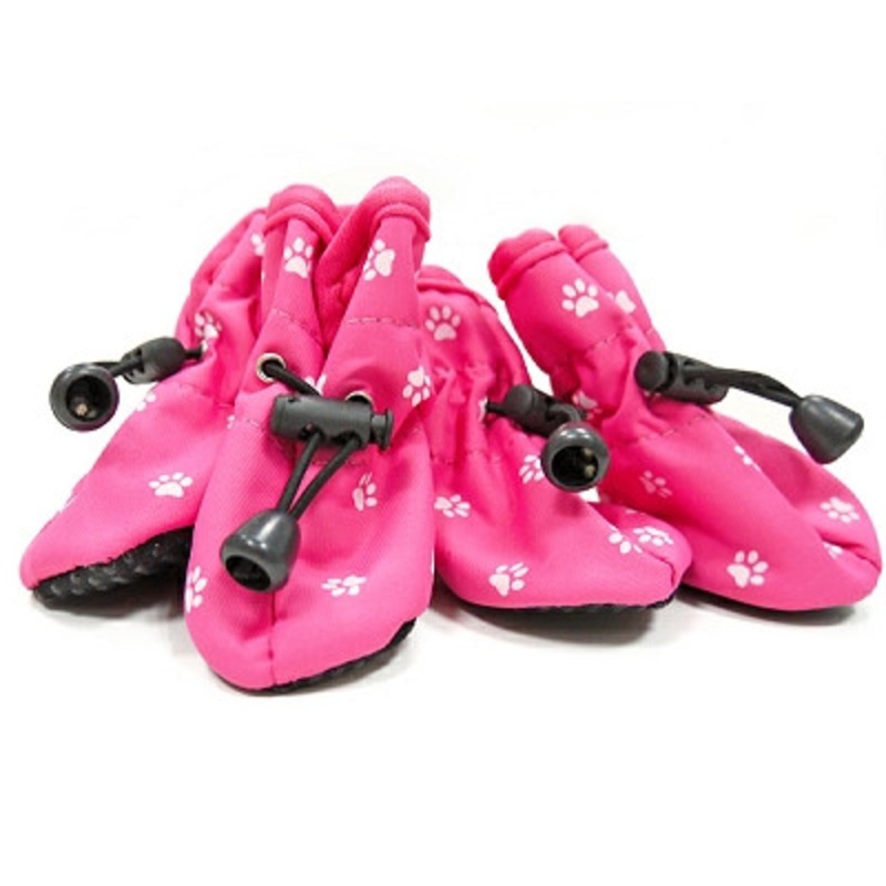 BAREBONE CLEARANCE - NOT RETURNABLE Slip On Paws Dog Boots - Pink Lightweight and easy to wear adorable Pink dog booties with paw prints. Fits high on the ankle for comfort! These doggie boots are soft with a dotted traction sole to avoid slipping. Easy to