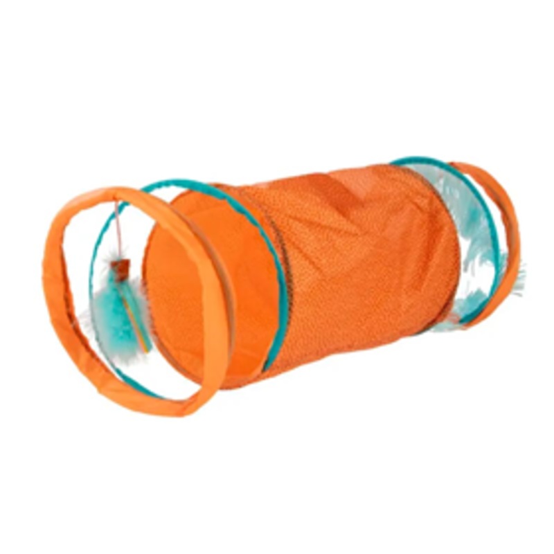 Instincts by SmartyKat Teaser Tunnel releases your cats inner instincts with fringe and attached dangling teaser cat toy with ribbons and plush feather boa. The tunnel material produces a rustling sound as your cat zooms through it, a proven attractant to