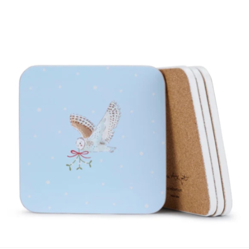 These wintery coasters add festive charm to any table setting or coffee table and will protect it from drips, marks and scratches. They come as a set of four, and feature Sophie's illustrations of graceful owls carrying a sprig of mistletoe on a snowy blue