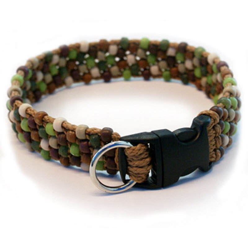 The Azzi is a Native American inspired design using the colors of the southwest, Brown, green, and tan. We use durable faux bone beads to create a unique and hip look for your pet!
