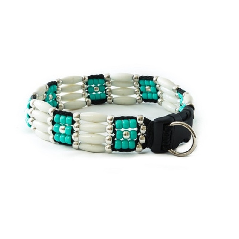 The Apache is a Native American inspired design using the colors of the southwest, turquoise, silver, and black. We use durable faux bone beads to create a unique and hip look for your pet!