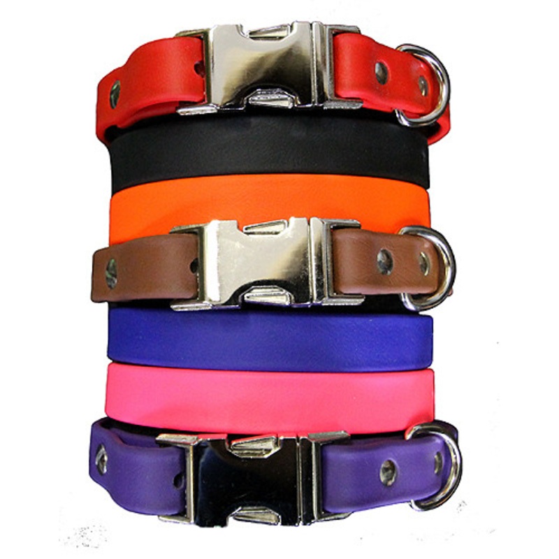 Sparky's ChoiceSide Release Dog CollarThis durable material is easy to clean, waterproof and will not absorb odors and remains flexible even in sub-zero weather. Perfect for the canine swimmers & romping in the snow! Easily adjusts to correct size by repos