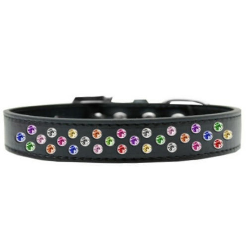 3/4″ wide collar adorned with 3 sprinkled rows of colorful rhinestones. Vegan leather.