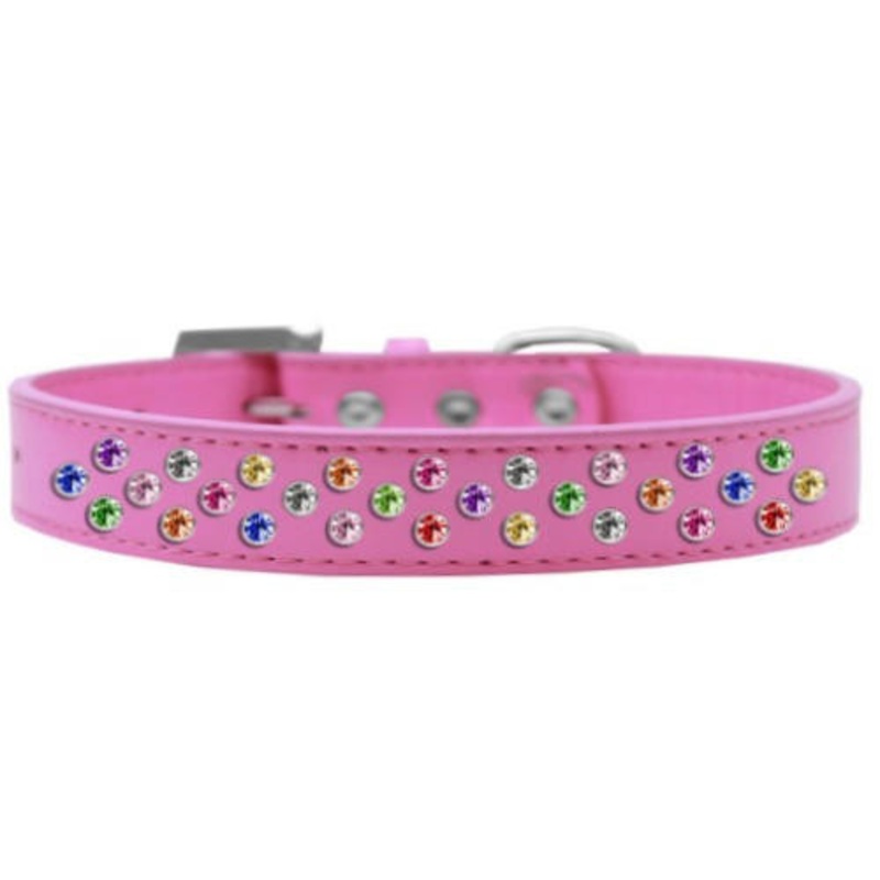 3/4" wide collar adorned with 3 sprinkled rows of colorful rhinestones. Vegan leather. SIZE NECK WIDTH 106-8"3/4"128-10"3/4"1410-12"3/4"1612-14"3/4"1814-16"7/8"2016-18"7/8"2218-20"7/8"2420-22"7/8"Made in the USA