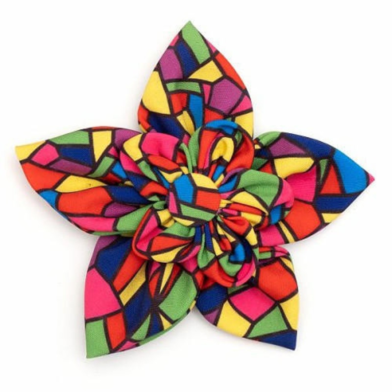 Stained GlassPet Dog Collar FlowerA great inexpensive way to spruce up any outfit or wear alone. Collar accessory for the posh pup (or cat)!Easy to attach to or remove from any collar with a soft and secure touch fastener strip on back. Available in size s