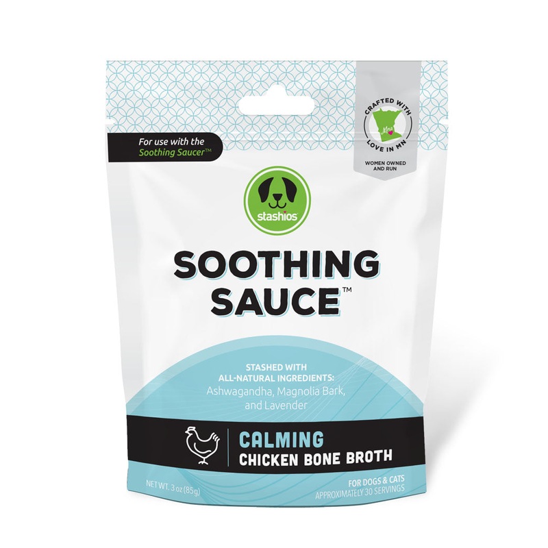 Soothing Sauce is stashed with all-natural calming ingredients:Ashwagandha, Magnolia Bark, and LavenderUse with StashiosSoothing Saucerfor additional benefits.Help relieve anxiety and soothe your dog in stressful situations such as:Thunderstorms, anxiety,