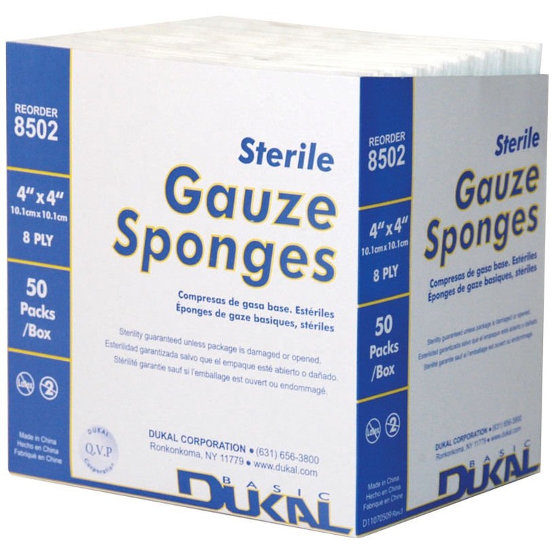 Basic 100% woven sterile cotton sponge. Latex free. 8 ply, 4″ x 4″. Box of 50
