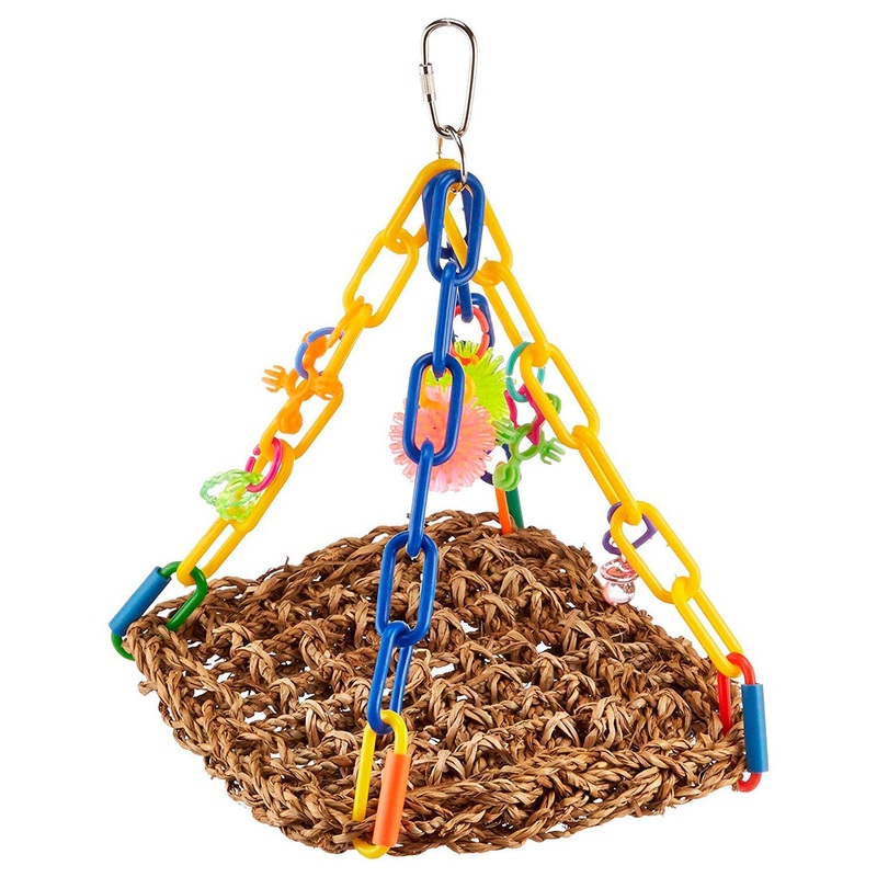 There is no greater fun for a bird than swinging around on a trapeze! Birds love to balance themselves and they enjoy chewing and biting. It is not only instinctive, but a crucial part of their development: they need to play and exercise constantly. Heres the perfect cage toy for your bird’s overall wellbeing and entertainment! Super Bird Creations developed this fun and attractive Mini trapeze toy for small size birds: a comfortable sea grass mat tied to multicolored plastic chains creating the ultimate bird swing. The yellow, Blue, orange, red, Pink, and green array of beads, links, chains, and porcupine balls hanging on the tiny trapeze will instantly catch your bird’s attention and invite it to play. This fun toy is designed to provide your pet with both exercise and entertainment. Ideal for parrot lets, parakeets, cockatiels, and lovebirds, this fantastic bird toy for small Parrots is a great cage accessory for your pet. It includes a reliable pear link cage connector, making it simple and easy to hang inside your bird’s cage.Age range description: all life stages. BIRD SAFE COMPONENTS & DESIGN Recommended by avian professionals worldwide, our products are expertly designed to maximize the safety and enrichment benefits to pet parrots. Bird owners can be confident that only the finest toy components are used. Proudly assembled in the USA since 1992. RELIEVES BOREDOM Properly designed bird toys are more than just toys. Super Bird Creations parrot toys are Playthings with a Purpose that help to ward off boredom, depression, aggression and destructive behaviors in parrots by stimulating physical activity, curiosity and mental engagement. ENRICHMENT BENEFITS – the Mini Flying Trapeze meets numerous enrichment needs. The easy to replace seagrass mat is a favorite of many birds to chew. The swinging platform promotes exercise, helps to develop coordination and balance skills and also provides a comfortable alternative rest area. DESIGN FEATURES This bird toy is crafted with a seagrass mat suspended by colorful plastic chain decorated with fun to explore toy parts. Utilizing a diverse selection of stimulating materials, colors, textures and shapes make Super Bird Creations toys of maximum interest to pet birds. FOR SMALL BIRDS The Mini Flying Trapeze bird toy by Super Bird Creations is the perfect size for perfect size for Parrotlets, Parakeets, Cockatiels, Lovebirds and similarly sized pet birds.Best Sellers Rank: See Top 100 in Pet Supplies. Country of Origin: USA. : B00JKXUDMI. Manufacturer: Super Bird Creations. Date First Available: April 9, 2014. Item model number: SB747. Product Dimensions: 6 x 7 x 9 inches; 3.2 Ounces. Is Discontinued By Manufacturer: No.