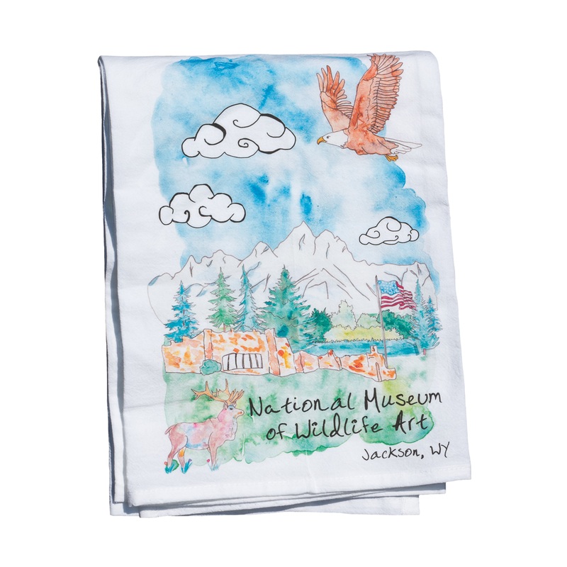 Custom made flour-sack tea towel featuring the iconic National Museum of Wildlife Art building with the Tetons behind it. The perfect souvenir, gift, or keepsake.