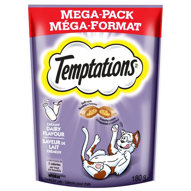 The most irresistible cat treats in the world, TEMPTATIONS are nutritionally complete and balanced for adult cat maintenance. Life with a cat can be so much fun, but our feline friends can be fickle they give us attention on their own terms. That’s why TEMPTATIONS are the perfect treat for any time you need a little love and any time you want your fur baby to be part of your special occasion. All it takes is a shake! TEMPTATIONS are so irresistible, just one shake of the pack will have even the most independent cat come running. Each TEMPTATIONS cat treat is a combination of delicious crunch and flavourful filling, and at less than two calories per treat and no artificial flavours, these are healthy cat treats you can feel good about giving your furry friend. TEMPTATIONS feline treats come in flavours cats love like Tasty Chicken, Savoury Salmon, Tempting Tuna, Hearty Beef, Tantalizing Turkey, Seafood Medley, Creamy Dairy, and Natural Free Range Chicken. Treat them daily with TEMPTATIONS by feeding 10 – 12 treats per 4.5kg of body weight. TEMPTATIONS cat treats are easy to store but be sure to reseal the bag after opening to help keep the treats fresh and irresistable.Canada’s Favourite: Temptations are Canada’s 1 cat treat. Irresistible: Temptations are the most irresistible cat treats in the world. Delicious Crunch, Flavourful Filling: Crunchy on the outside, soft on the inside no wonder cats love TEMPTATIONS. Just The Good Stuff: Less than 2 calories each and made with no artificial flavours. Feel Good About Treating: These healthy cat treats are nutritionally complete and balanced. Contains: One (1) 180g pouch of Temptations Cat Treats, Creamy Dairy Flavour, Mega-Pack.