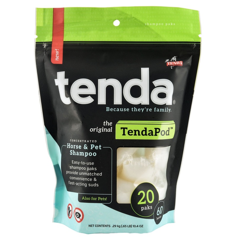 TendaPodA concentrated, easy-to-use horse & pet shampoo pod. Simply toss one TendaPod into the bathing bucket, add water, and sponge bathe up to three horses. These scientifically, fast-acting suds guarantee you will be bathing your horse like a profession