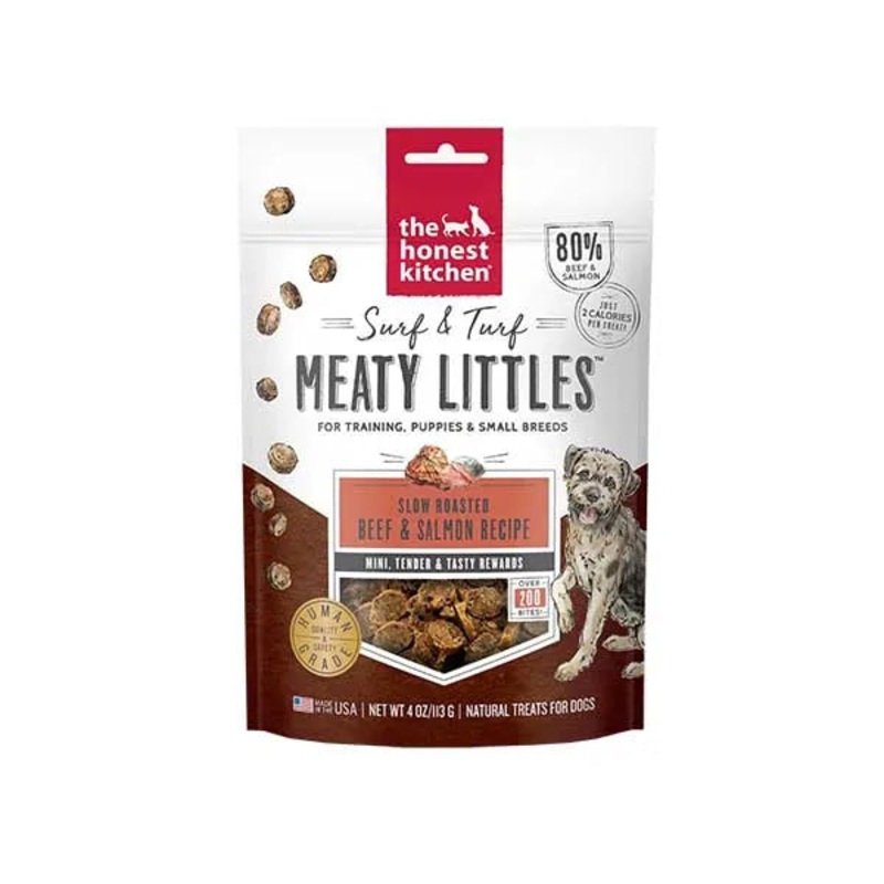 The Honest Kitchen Surf & Turf Meaty Littlesare a small-sized treat made with natural human-grade ingredients that are great to introduce to your puppy or for training. The Beef & Salmon recipe is crafted with 80% grass-fed beef and salmon mixed with chick