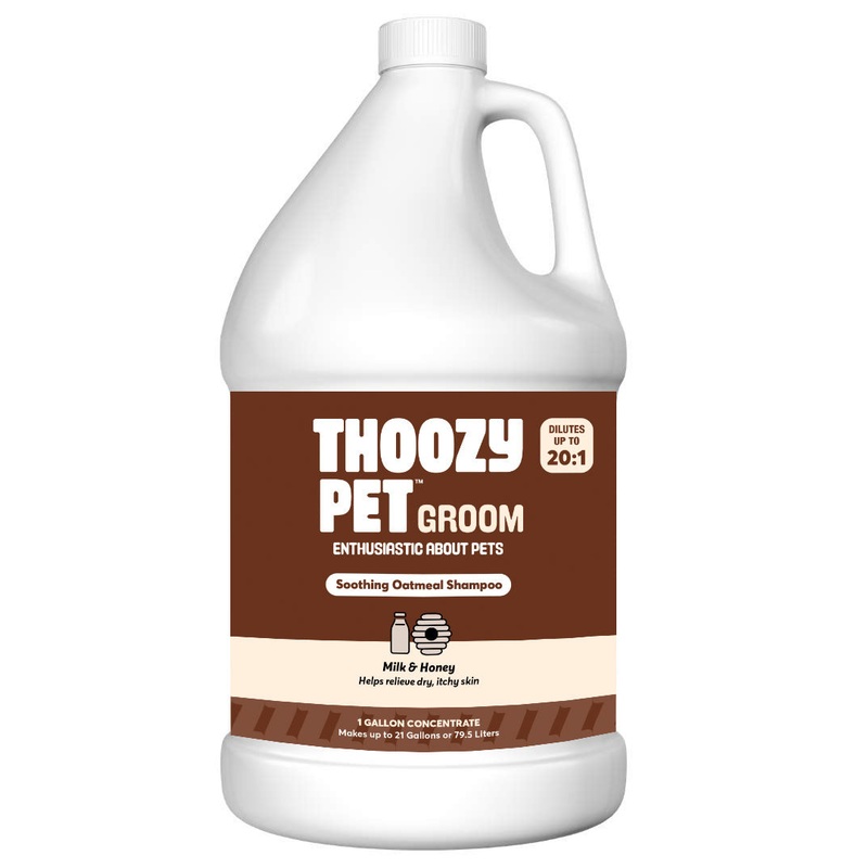 ThoozyPet Soothing Oatmeal Shampoo in Milk & Honey (1-gallon concentrate) is specially formulated to help relieve dry, itchy skin, providing soothing comfort for your pet. This concentrated formula dilutes 20:1, making it the perfect choice for grooming sa