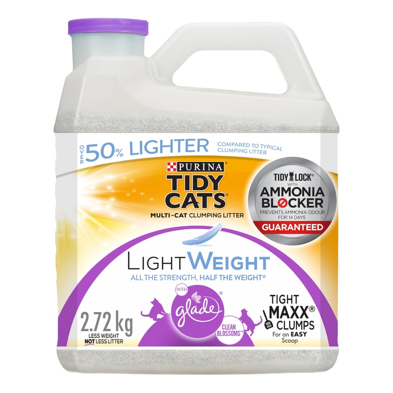 Combine powerful odour neutralization with a pleasant scent when you use Tidy Cats LightWeight cat litter with Glade Clean Blossoms. The light fragrance in this 99.9 dust free litter leaves your cats’ litter box area smelling fresh and clean, while the Glade Tough Odour Solutions technology defends against overpowering smells. A powerful Ammonia Blocker prevents ammonia odour for 14 days guaranteed, when used as directed. Weighing half as much as the leading clumping cat litter, this lightweight formula is easy to use, and the strong clumping action makes litter box maintenance quick and simple. Put this powerfully absorbent cat litter to use in your home, and make each litter box a welcoming place for your cats.Tight Maxx Clumps for an easy scoop. Designed to accommodate multiple cats. Easy to carry, pour and store. 99.9 Dust Free. Lightweight formula is over 50 lighter than the leading clumping litter. Light, pleasant Glade Clean Blossoms fragrance keeps your home smelling fresh. Ammonia Blocker prevents ammonia odour for 14 days, guaranteed.