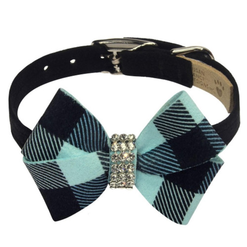 Tiffi Blue Gingham Nouveau Bow Dog Collarby Susan LanciSmile! Its Gingham style. This collar has a premium look and feel, while being easy for you to maintain. Made from Ultrasuede fabric with the soft texture and feel of premium suede.The Red Gingham bow