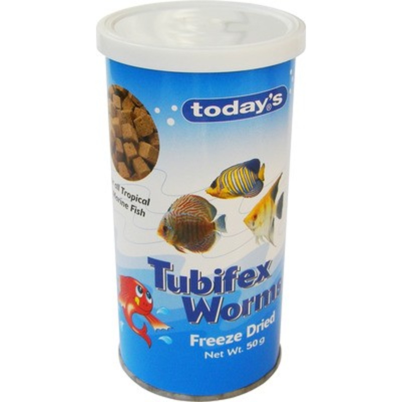 Todays Freeze Dried wild caught Tubifex Worms.New pop top.Todays unique food is actually tubifex worms processed by the new freeze dried technique.Removal of moisture under vacuum at sub zero temperature.This process preserves the excellent nutritional fac