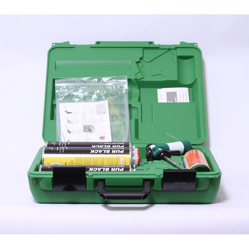 Starter Kit includes:3 cans of BLACK Foam, 1 Pageris Gun, 1 canPur Fill gun cleaner, 2 foot Plastic tubing,5 plastic needles, 1 plastic adaptor, 1 foam reducer, and a product catalog- packed in a hard plastic case.