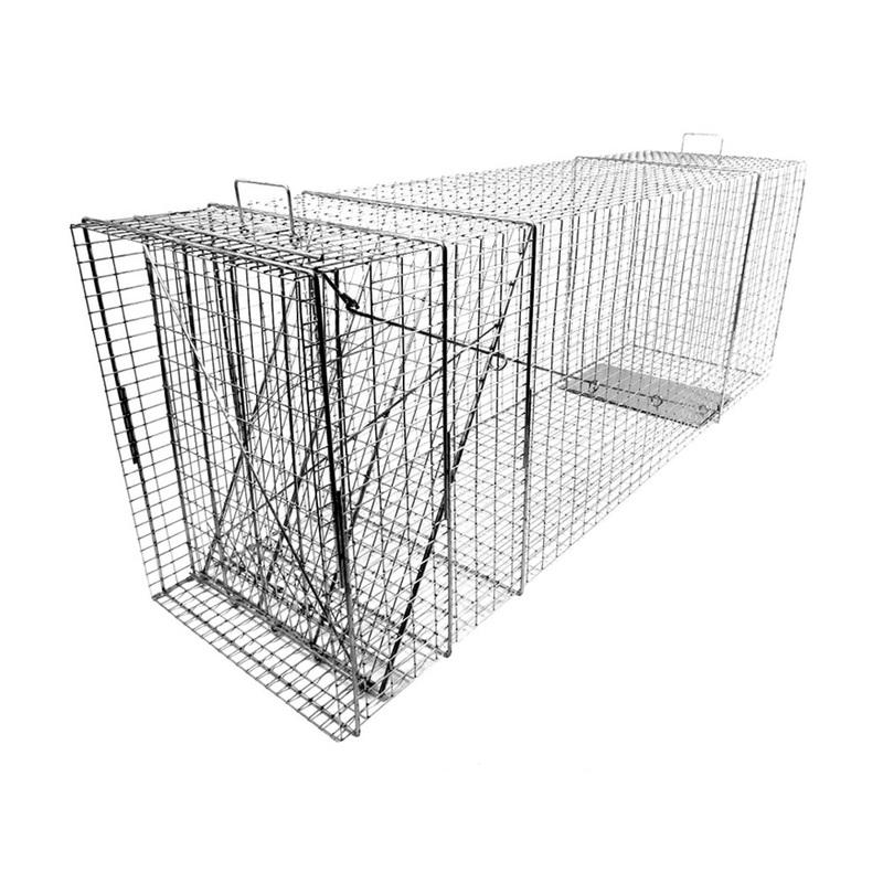 Tomahawk Live Trap Model 110C is an Original Series live trap designed for large dogs, coyote and similar size animals. This cage trap weighs 40 lbs and measures 72L x 20W x 26H. It is constructed from 1″ x 2″ – 12 gauge galvanized wire mesh.