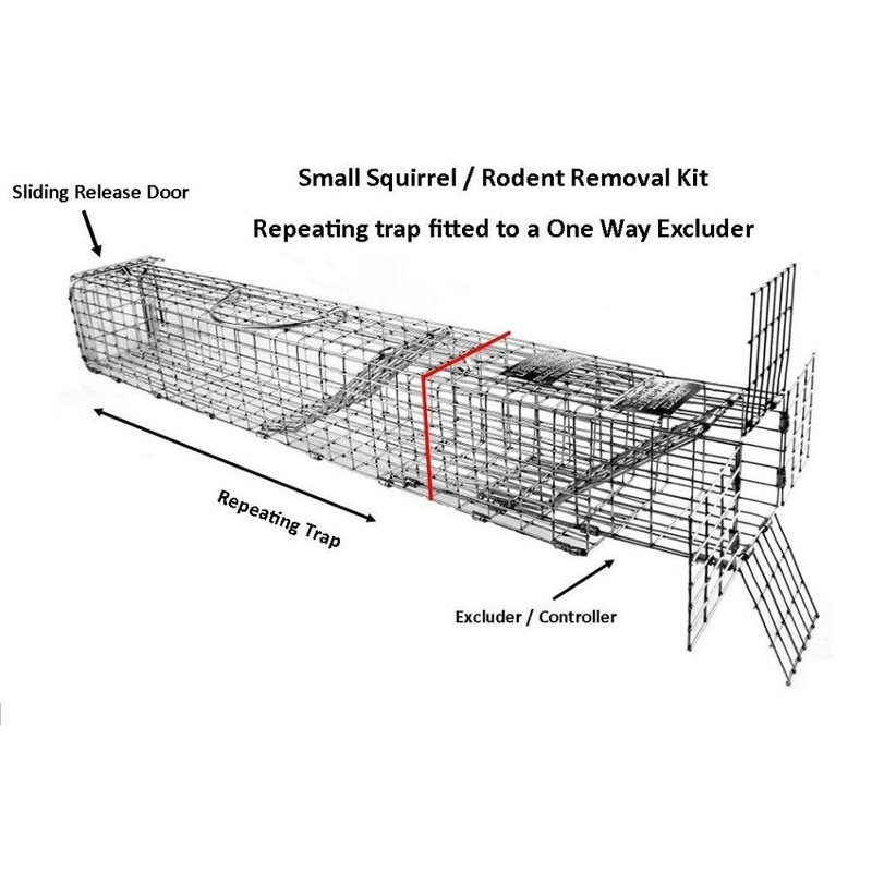 The Tomahawk Squirrel Pack, Model SP50, is perfect for squirrels, rodents and similar size animals. It is extremely simple to use and very effective. This model consists of one E50 excluder and two SPT50 repeating traps. The repeating traps have one trap d