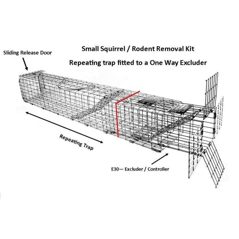 The Tomahawk Squirrel Pack, Model SP30, is perfect for flying squirrels,rodents and similar size animals. It is extremely simple to use and very effective. This model consists of one E30 excluder and two SPT30 repeating traps. The repeating traps have one