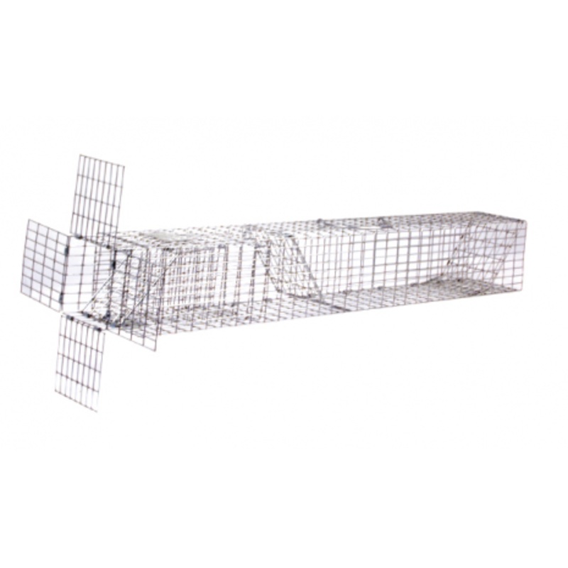 Attach the E30 excluder over the animals den opening with the mounting wings. Slide one of the SPT35 repeating traps over the E30 and hook into place. As critters exit, the excluder will direct them into the repeating trap. SPT35 repeating traps have trap doors at each end to allow you to capture animals both leaving and entering the den. To remove trapped animals, unhook the SPT35 repeating trap and replace it with the other one included with this kit.