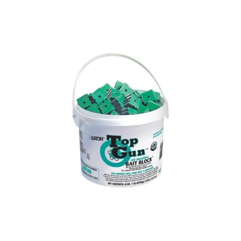 Top GunAll Weather Bait BlockRodenticide with Bromethalin is a fast acting rodent bait that gives you quick results with an average death in 1-2 days. Top Gunalso has a stop feeding feature in order to conserve bait. Rodents only eat enough to get one lethal dose. In order to discourage children and pets from eating this bait, it contains bitrex. Even though the bait contains bitrex, always use tamper-resistant bait stations around children and pets. Due to its fast action, Top Gunis an ideal bait for situations where a quick clean out is needed. It will also work as a maintenance bait, due to its stop feeding feature.