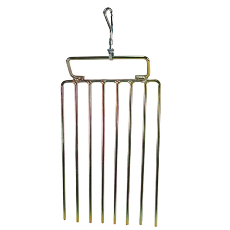 Trap Divider (Fork), fits a 9″ wide or smaller cage trap, measures 7″W x 10″H (7″W x 12″H including handle). This trap divider is constructed of 1/4″ steel rod and has 1″ spacing between the tines of the fork. Electro-plated with yellow zinc for rust-resistance