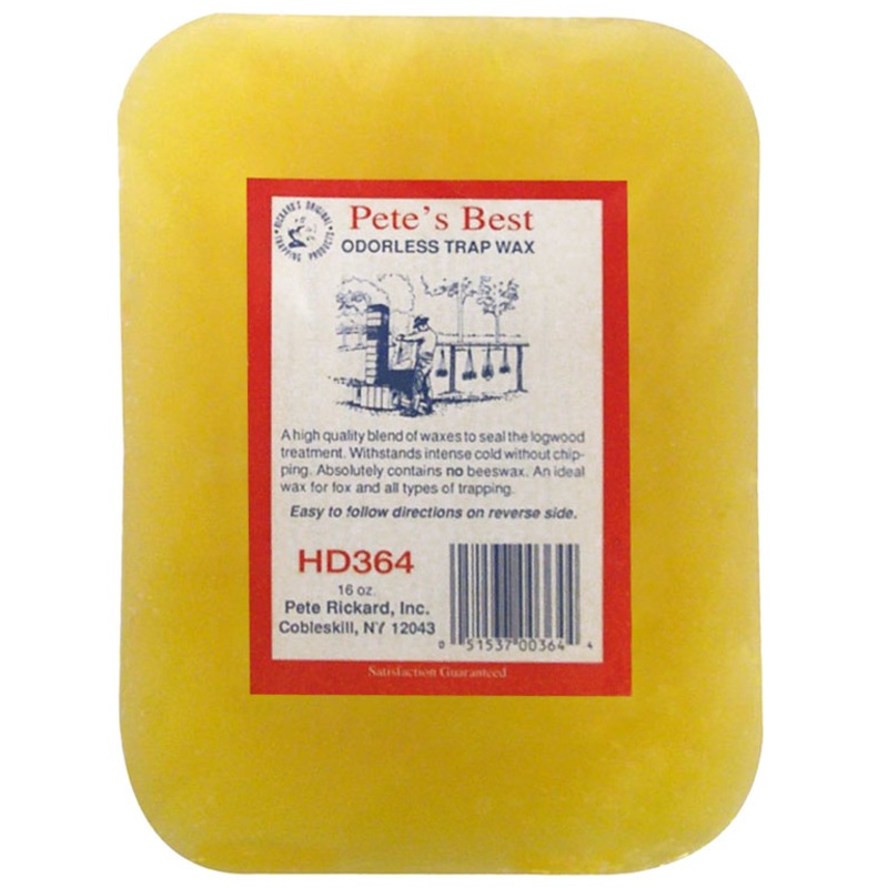 Pete Rickard's HD364 Pete's Best Yellow Odorless Trap Wax 1 lb. Not brittle in winter or sticky on warm days. Each bar is wrapped in a plastic bag for protection. Each bar does approximately two dozen traps.