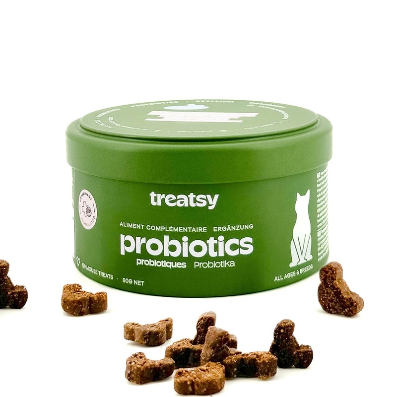 For cats of all ages and breeds. The daily intake for a 4-5 kg cat is 4 bites of 0.75 g. The can contains 120 bites. Very high palatability: 85 acceptance observed in tests in veterinary clinics, at home and in cat shelters. Treat-based supplements are much easier to administer to cats than tablets, capsules or powder, making Treatsy a favorite product for many veterinarians. Contains prebiotics, probiotics and postbiotics. A daily dose provides more than 2 billion CFU of probiotics from 2 different strains (Enterococcus Faecium and Lactobacillus Helveticus), prebiotics (such as pectin and FOS), psyllium, postbiotics and l-glutamine to strengthen the intestinal wall. Grain-free, with no artificial flavors or colors. Phosphorus-free. Formulated by veterinary nutritionists and recommended in hundreds of veterinary clinics across Europe. A highly concentrated digestive supplement with scientifically proven active ingredients to help reduce diarrhea and constipation, promote digestion, and strengthen the intestinal wall.Pour les chats de tous ges et de toutes races. La quantit quotidienne pour un chat de 4 5 kilos est de 4 bouches de 0,75 g. La bote contient 120 bouches. Trs haute apptence : 85 d’acceptation constate lors de tests en cliniques vtrinaires, domicile et dans les refuges pour chats. Les complments sous forme de friandises sont beaucoup plus faciles administrer aux chats que les comprims, les glules ou la poudre, ce qui fait de Treatsy un produit favori pour de nombreux vtrinaires. Contient des prbiotiques, des probiotiques et des postbiotiques. Une dose quotidienne offre plus de 2 milliards d’UFC de probiotiques de 2 souches diffrentes (Enterococcus Faecium et Lactobacillus Helveticus), des prbiotiques (tels que la pectine et les FOS), du psyllium, des postbiotiques et de la l-glutamine pour renforcer la paroi intestinale. Sans crales, sans armes ni colorants artificiels. Sans phosphore. Formul par des vtrinaires-nutritionnistes et recommand dans des centaines de cliniques vtrinaires en Europe. Aliment complmentaire digestif hautement concentr en ingrdients actifs scientifiquement prouvs pour aider rduire la diarrhe et la constipation, pour favoriser la digestion et pour renforcer la paroi intestinale.
