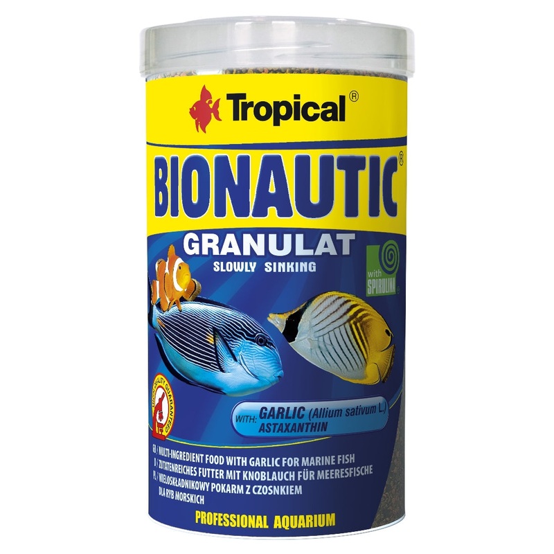 BIONAUTIC slowly sinking granules for marine fish. Multi-ingredient, slowly sinking granules intended for everyday feeding of omnivorous small and medium marine fish such as Acanthurus japonicus, Amphiprion clarkii, Amphiprion ocellaris, Centropyge bicolor, Chelmon rostratus, Chaetodon auriga, Zebrasoma flavescens and crustaceans. It contains mostly raw materials of marine origin, which ensure excellent condition of fish. Another valuable ingredient is spirulina (3%), rich in easily assimilable protein and vitamins, trace elements and natural carotenoids. Spirulina facilitates proper functioning of fish’s alimentary tract, protecting them against dangerous consequences of constipations.