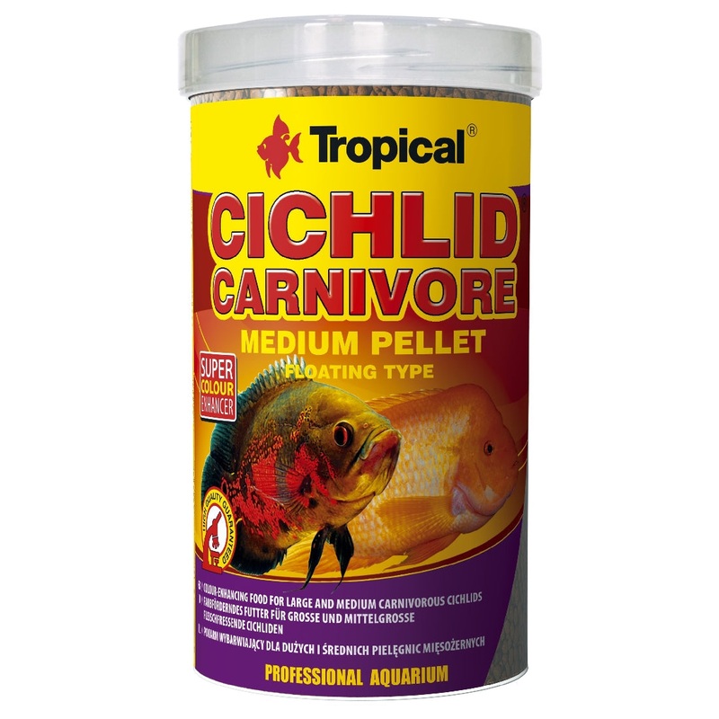 CICHLID CARNIVORE MEDIUM PELLET colour-enhancing floating granules for medium and large cichlids. Colour-enhancing food for everyday feeding of medium and large carnivorous cichlids, e.g.: Astronotus ocellatus, Copadichromis borleyi. A high content of natu