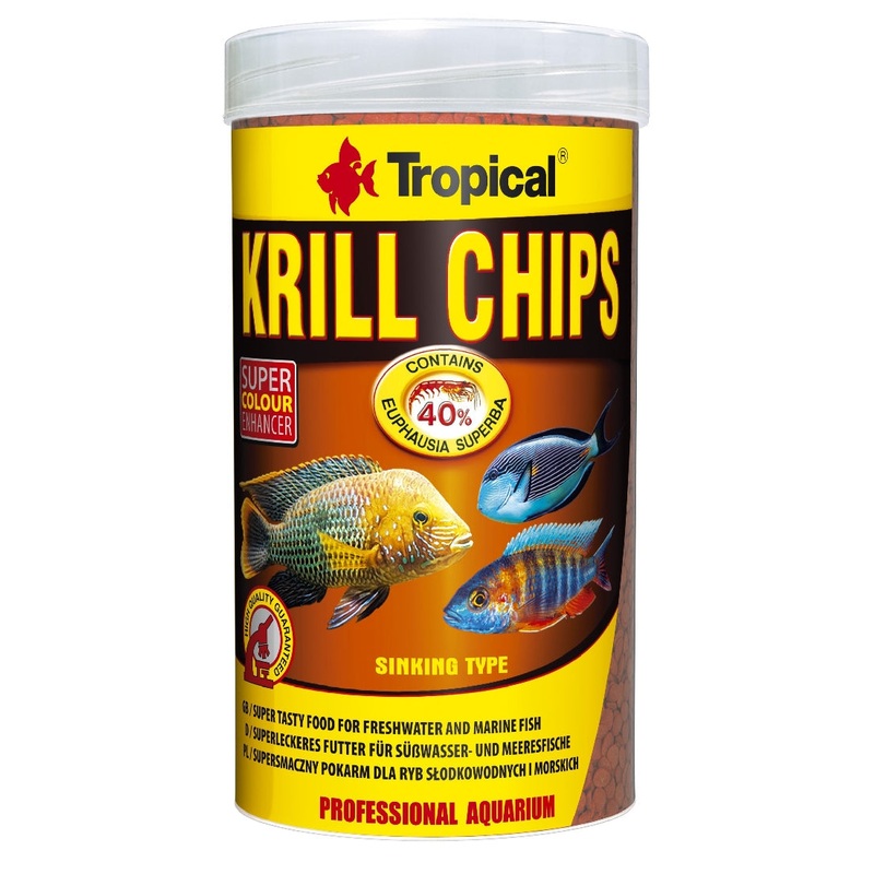 KRILL CHIPS super tasty, colour-enhancing fish food with krill. Multi-ingredient, colour-enhancing food in the form of chips with a high content of krill (40%). Intended for everyday feeding of omnivorous and carnivorous fish in marine and freshwater tanks