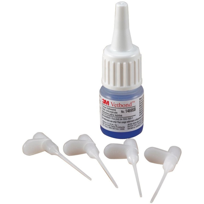 Vetbond Liquid Tissue Adhesive by 3MForms a thin, flexible bandage in seconds to stop minor bleeding and bind wound edges. Comes with extension tube for hard to reach places. Each vial of VETBOND contains 0.1 fl. oz. (3 mL) of product and dispenses approxi
