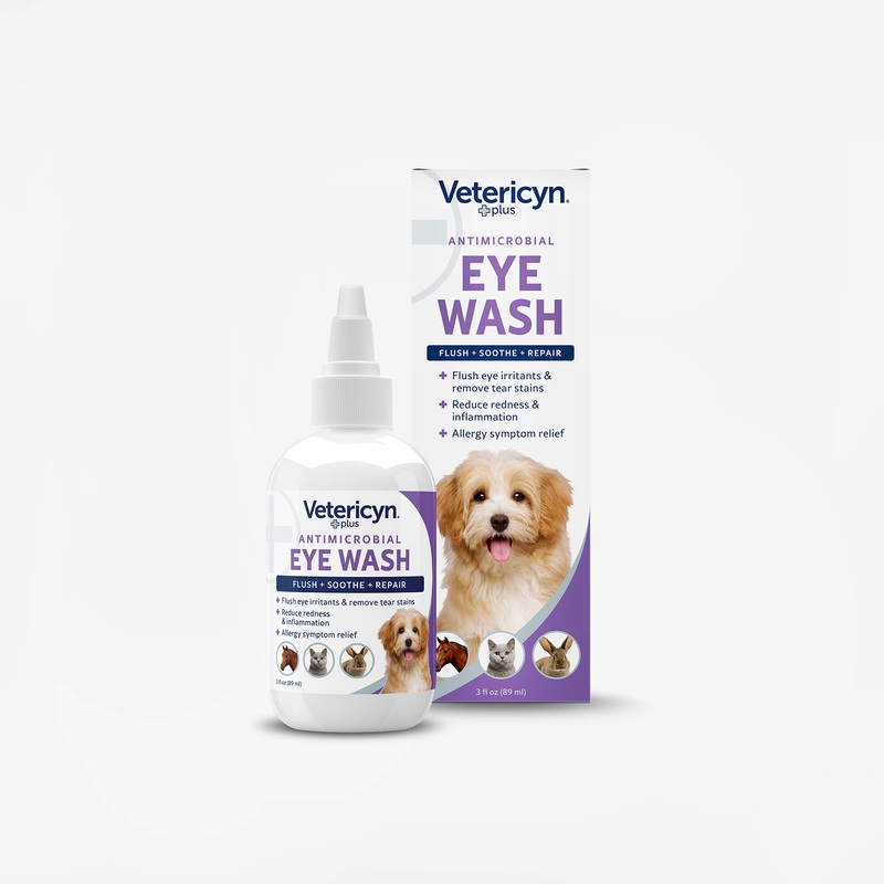 Vetericyn Plus Eye Wash is a non-stinging solution that gently cleans the eyes and surrounding tissue to help relieve irritation and burning, remove debris, and control issues caused by mucous, pollen, and other irritants. It also cleans tear stains to leave the fur surrounding the eye clean and free of the bacteria that leads to discoloration.