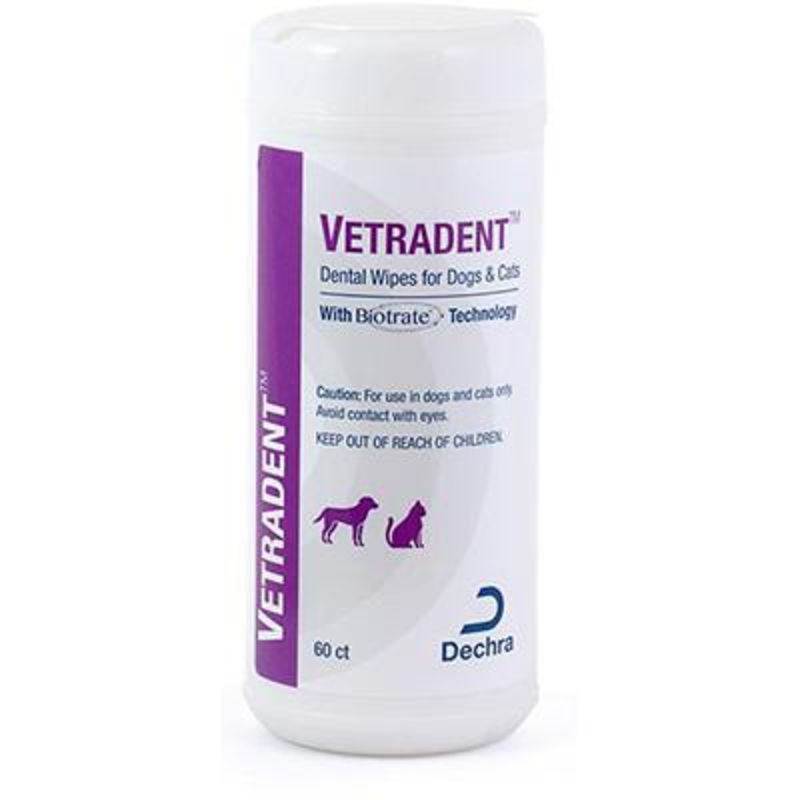 Vetradent Dental Wipes with Biotrate Technology helps control plaque and tartar formation while freshening your dog or cats breath. Biotrate Technology works against dental-associated bacteria by altering the mouths environment, it breaks through the dental biofilm leaving otherwise inaccessible bacteria exposed for eradication.