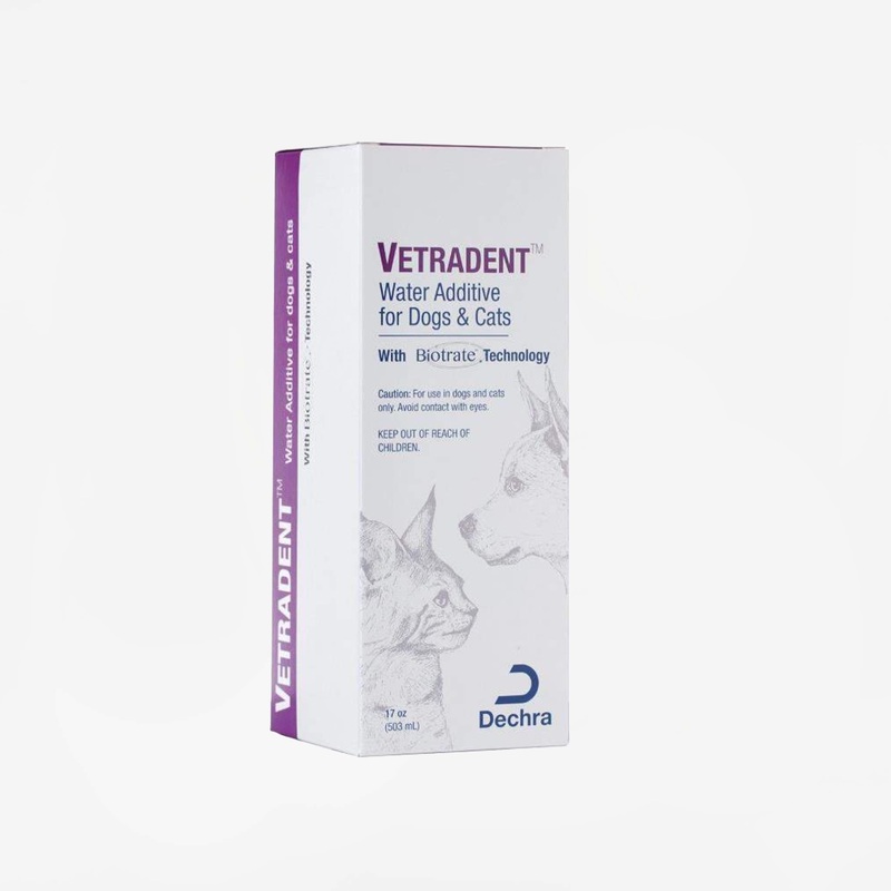 Vetradent Water Additive reduces plaque and tartar in the mouth and supports oral health for dogs and cats.This odorless, tasteless, and colorless liquid contains Biotrate technology to break through biofilm in the mouth, and reduce the bacteria responsibl