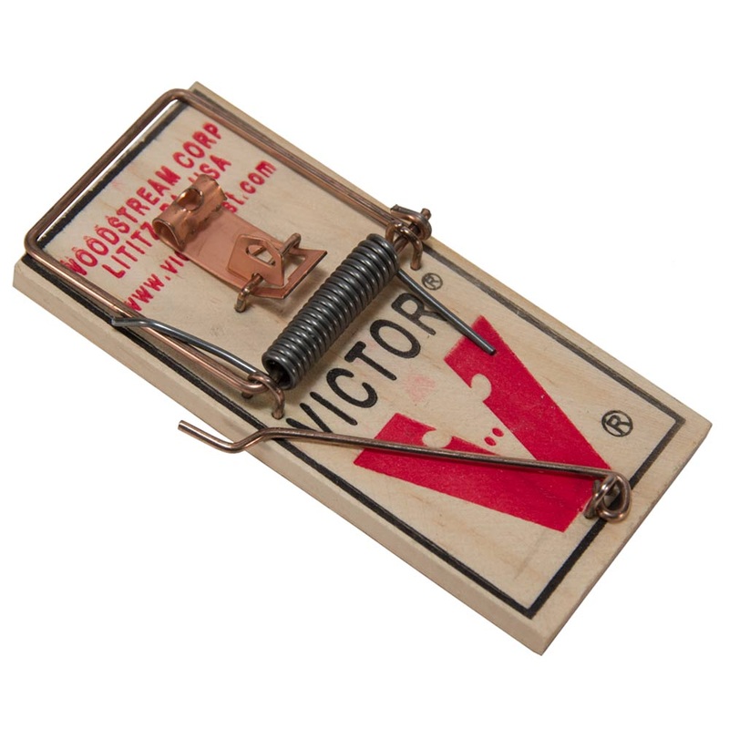 VictorStandard Mouse Trap with the metal pedal that most people are familiar with. This trap can be set in a baited or unbaited manner. It is meant to be placed perpendicular to a wall so the mouse travels over the metal triggering pedal.