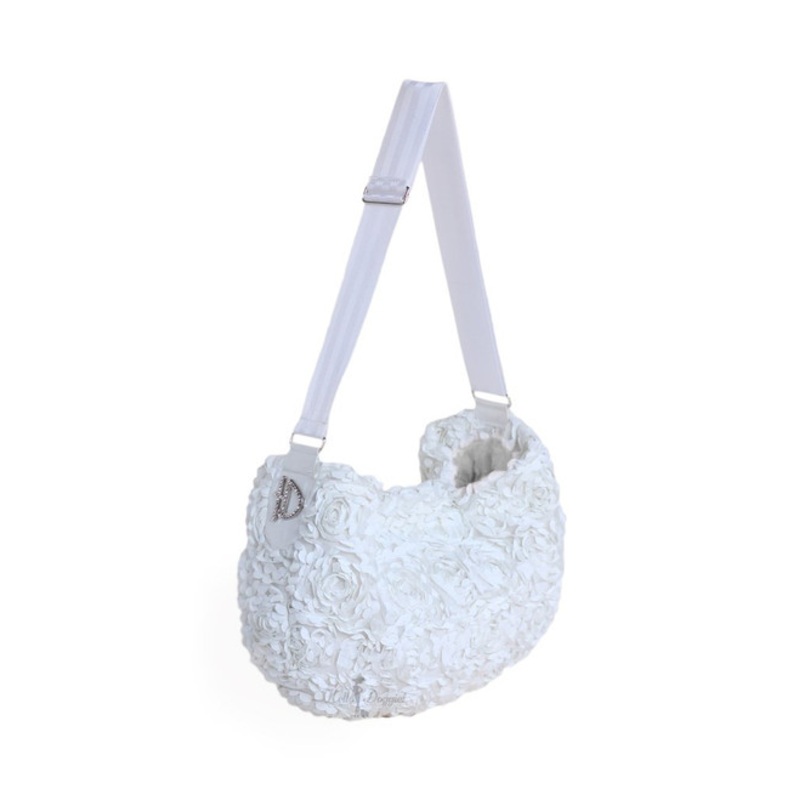 Victorian Luxury Pet Dog Messenger Sling -White This Victorian light weight Luxury messenger style pet carrier by Hello Doggie features frilly rose fabric, luxurious faux fur lining, an exterior zipped pocket, adjustable shoulder strap, and interior safety