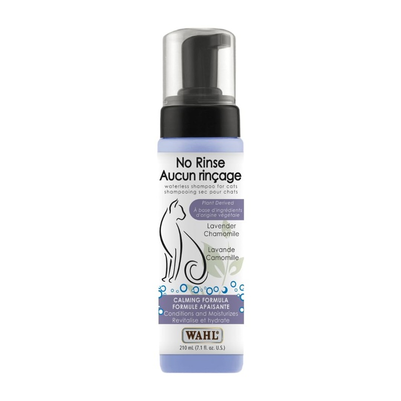 Wahl no-rinse Waterless cat Shampoo, lavender chamomile calming formula conditions and moisturizes, 210ml.Country of Origin: United States. Plant Derived. Package Dimensions: 7.4 L x 22.2 H x 12.8 W (centimeters). No rinsing needed.