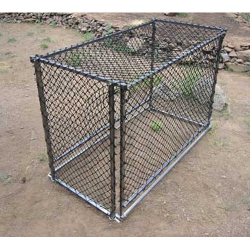 The WCS Deer/Elk Trap is a proven design capable of capturing a variety of larger wildlife and exotic game animals. The trap measures 6’Hx4’Wx7’6″L. Heavy nylon, mesh netting covers a frame of 1″ steel tubing. Simple to use, once assembled and secured to prevent captured animals from tipping the trap, bait is placed in the rear of the trap.