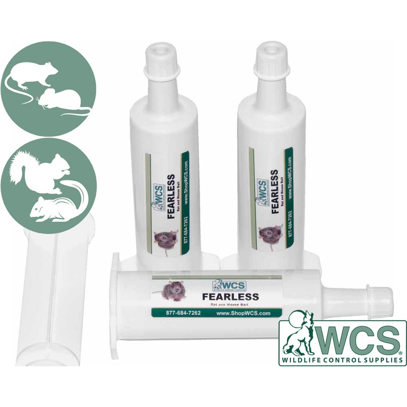 Our newest paste bait,WCSFearlessRat and Mouse Bait, is a proprietary blend of nut oils and meats (No Peanuts), seeds, and a special ingredient scientifically proven to reduce neophobic behavior in rodents. Excellent results with squirrels and chipmunks as well. Like all of the WCSPremium Grade Bait Products, Fearless is spiked with an anti-drying agent to increase the baits effectiveness. Use it with the included plunger or try it with ourPaste Bait Gunfor added convenience.
