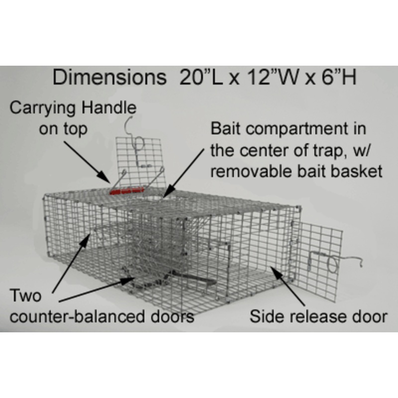 WCS Multi-Catch Rodent trap for Chipmunk/Rat/Flying Squirrel. This trap measures 20"L x 12"W x 6"H and is constructed of 1" x .5" galvanized wire mesh. It has two counter-balanced entry doors that are alongside the interior bait compartment. When the anima