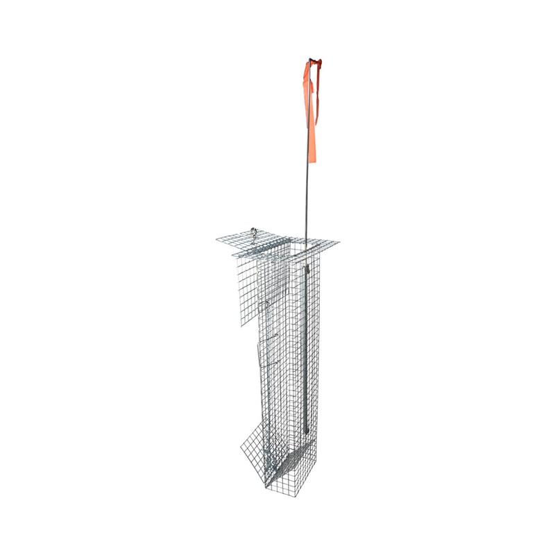 The innovativeWCS No-See 'Umchimney raccoon trapfits right down into the chimney flue and is hidden from sight. The locking mechanism of the No See'Um trap hasavisual indicator (flag)attached which allows you or your customer to check the trap from the gro