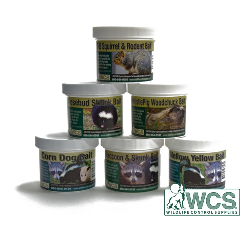 WCS “Premium Grade” Paste Bait Sampler, this is six (6) 4 oz. jars of each of the following time-tested paste baits: NB for Squirrels and all other rodents; TreeBerry for raccoons, skunk, opposum, armadillo; Mello Yellow primarily for raccoon and skunk; Rosebud for skunk, will not catch cats; Corn Dog for raccoon & skunk; and last but certainly not least, Whistle Pig for ground hogs.Please Note: This product is an attractant ONLY, not a poison. Not for human consumption.