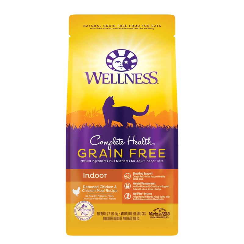 Wellness Complete Health Grain Free Indoor Chicken Recipe features the right balance of protein & fat that cats crave. Healthy fiber and L-Carnitine help to support cats with a less active lifestyle. This delicious recipe is formulated with a balanced blend of Omega Fatty Acids, vitamins & minerals to provide the energy your cat needs to thrive.Manufactured in a facility that also processes grains. MADE IN THE USA: using only the finest globally sourced ingredients, we prepare each of our diets in our own state of the art facility; we craft delicious natural recipes with wholesome, non GMO ingredients chosen for their nutritional benefits. CATISFACTION PROMISE: Wellness offers a full range of wet and dry cat food to support your cat’s specific taste preferences and needs with dozens of flavors, textures and solutions. WHOLE BODY HEALTH: Crafted to support your cat’s total wellbeing including plenty of energy for playtime, a lustrous skin and coat, sound digestion and immunity, strong teeth and healthy eyes, plus controlled minerals for urinary health support. SPECIALLY MADE FOR INDOOR CATS: This Indoor dry grain free recipe was crafted to support cats with a less active lifestyle with healthy fiber, L’Carnitine and just the right balance of protein and fat from chicken, perfect for cats that love poultry. ENJOY A LIFETIME OF WELLBEING TOGETHER: Working with our staff of vets, nutritionists and scientists, we create each diet to deliver everything your cat needs to thrive, for a lifetime.