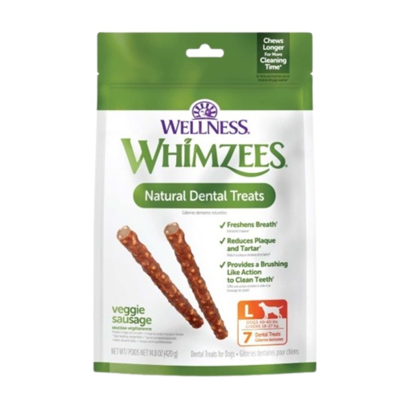 You brush daily, your dog should too! Give your dog one WHIMZEES Veggie Sausage Dog Dental Treat per day and youre giving them a fun, all natural way to help clean teeth, freshen breath, and reduce plaque and tartar all while they chew! Dental disease is t
