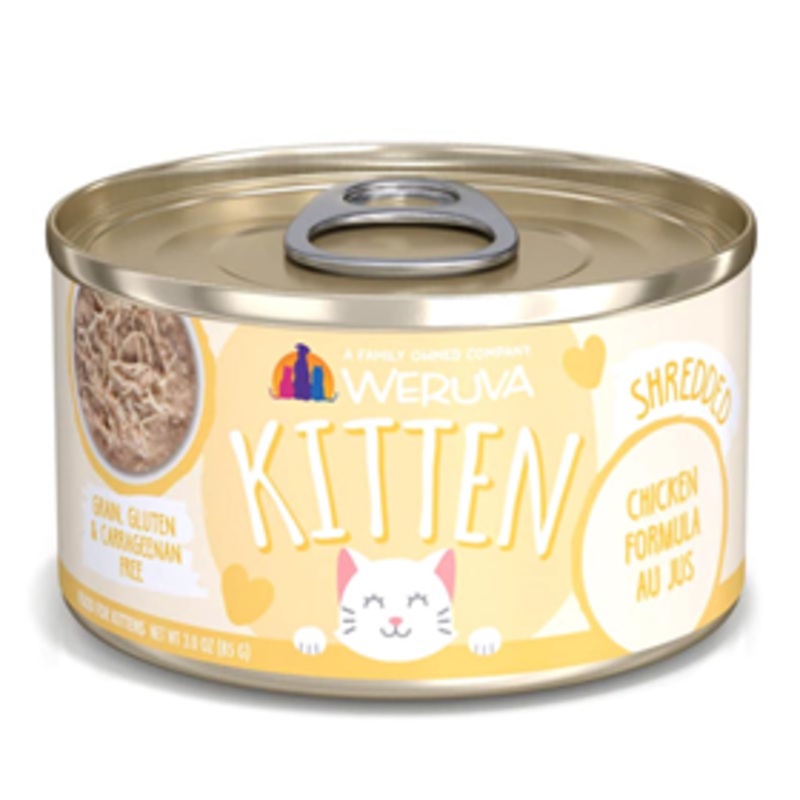 Get ready for your kitten to dash over to their bowl to lap up this tasty meal! The shredded chicken in an au jus will make them jump for joy until you open up the next can. 3 oz.Weruva Kitten recipes provide your kitten with the high quality ingredients y